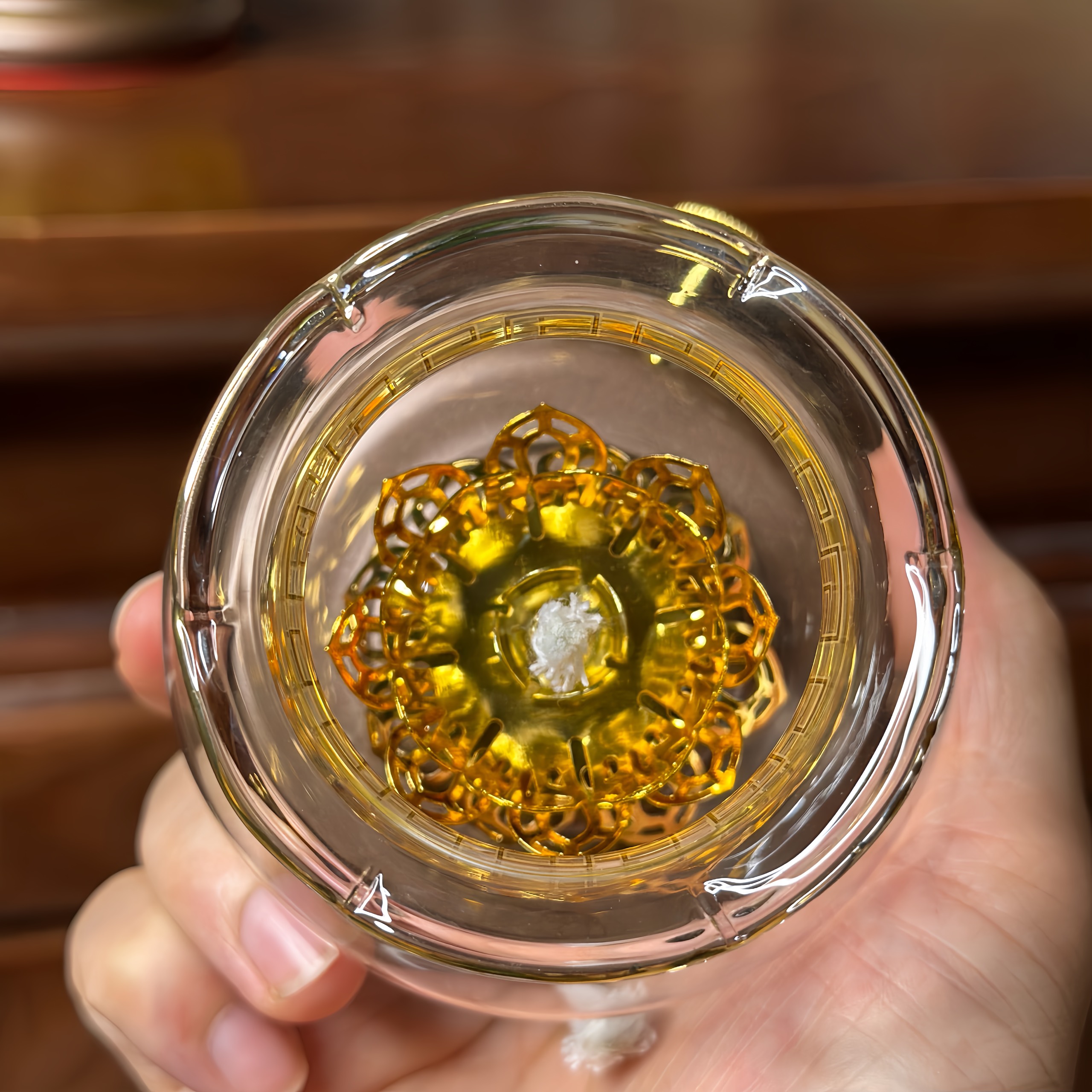 Thân Đèn làm bằng thủy tinh dày với họa tiết hoa văn hoa sen đẹp sắc nét.